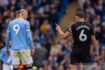 Pesepak bola Manchester City Erling Haaland (kiri) berbincang dengan pesepak bola Everton FC James Tarkowski (kanan) saat pertandingan Liga Inggris antara Manchester City FC melawan Everton FC di Stadion Etihad, Manchester, Britania Raya, Sabtu, (18/10/2025. Manchester City raih kemenangan 2-0 atas Everton FC. ANTARA FOTO/Xinhua/agr